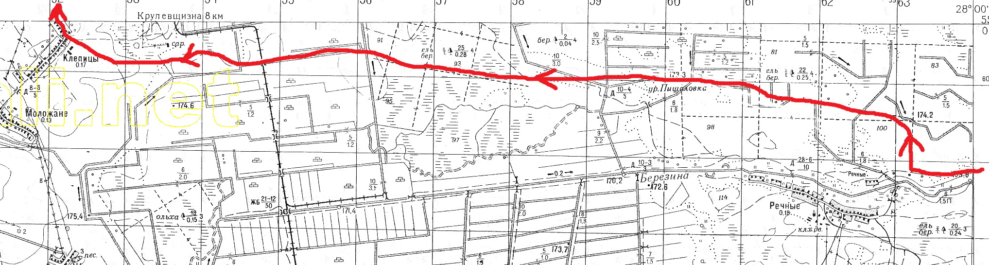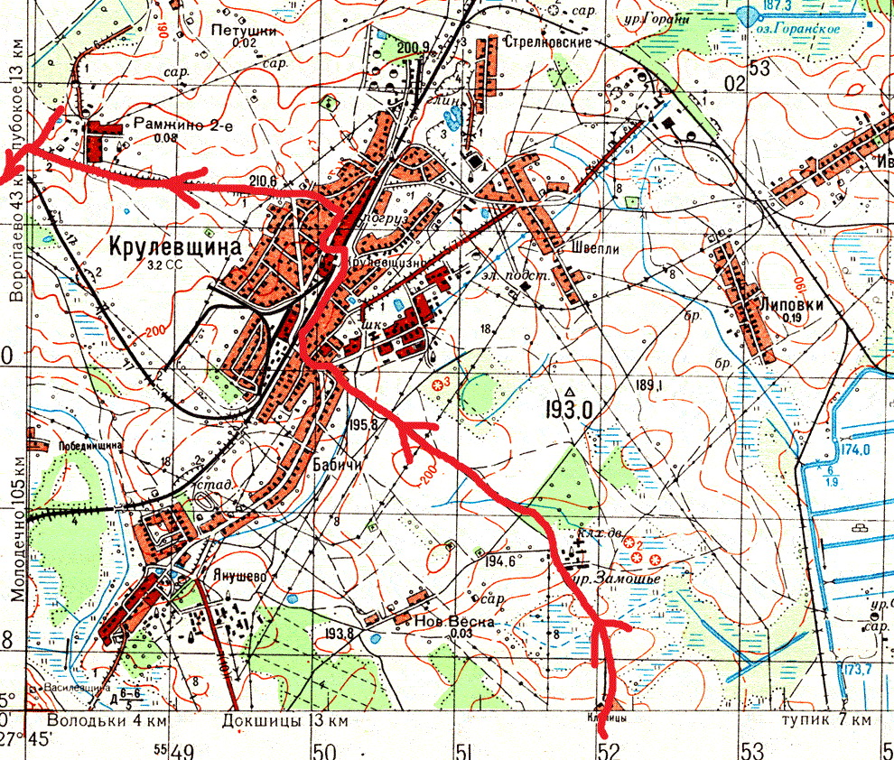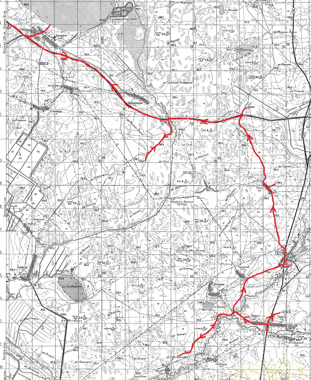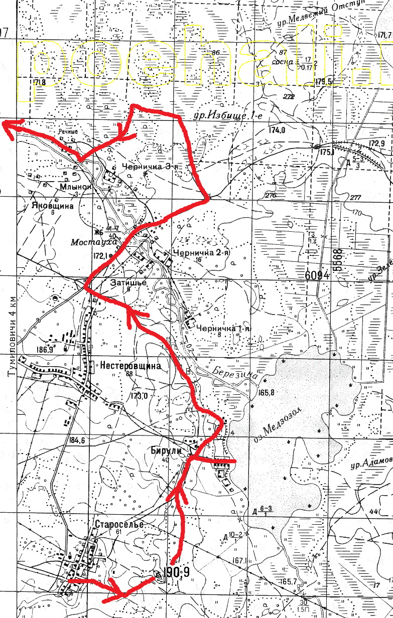Затем, пройдя д. Нестеровщина, мы свернули на северо‑восток. В д. Черничка 2‑я пересекли реку Березина. После указанной деревни группа свернула на запад, и мы довольно долго шли по технологической лесной дороге без населённых пунктов. Когда стало темнеть, группа свернула на юг, и на живописном берегу Березины мы стали на ночлег.